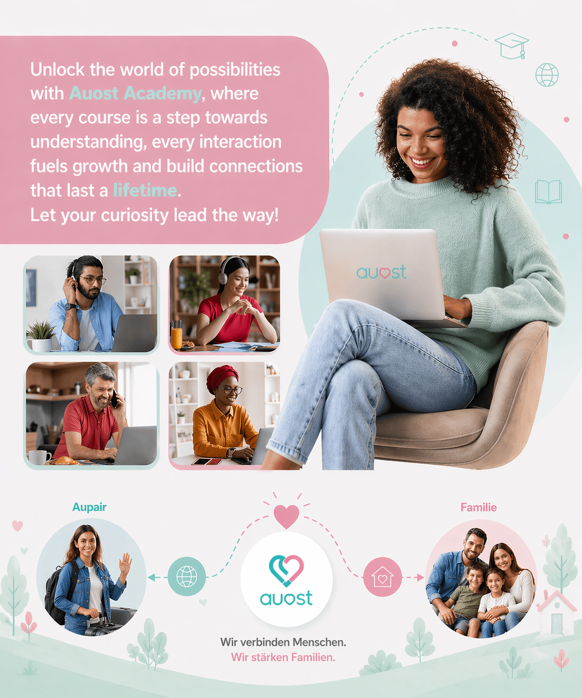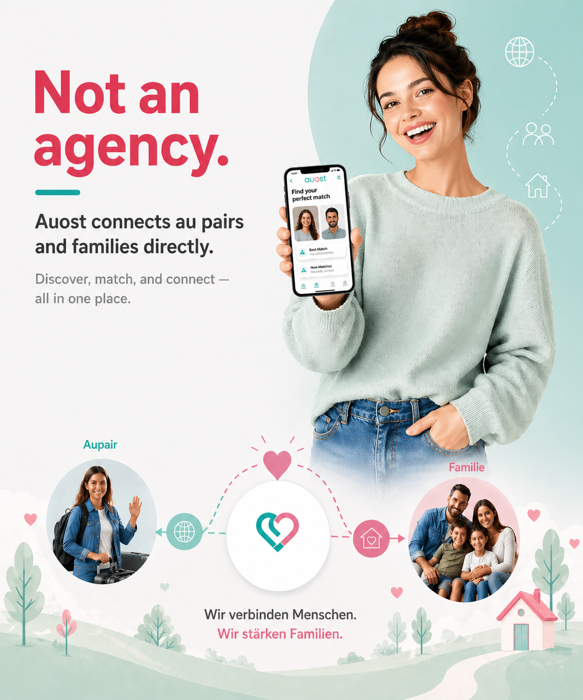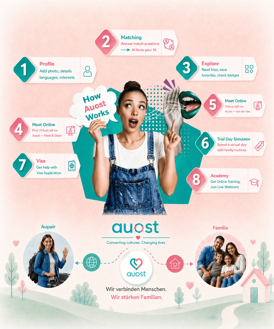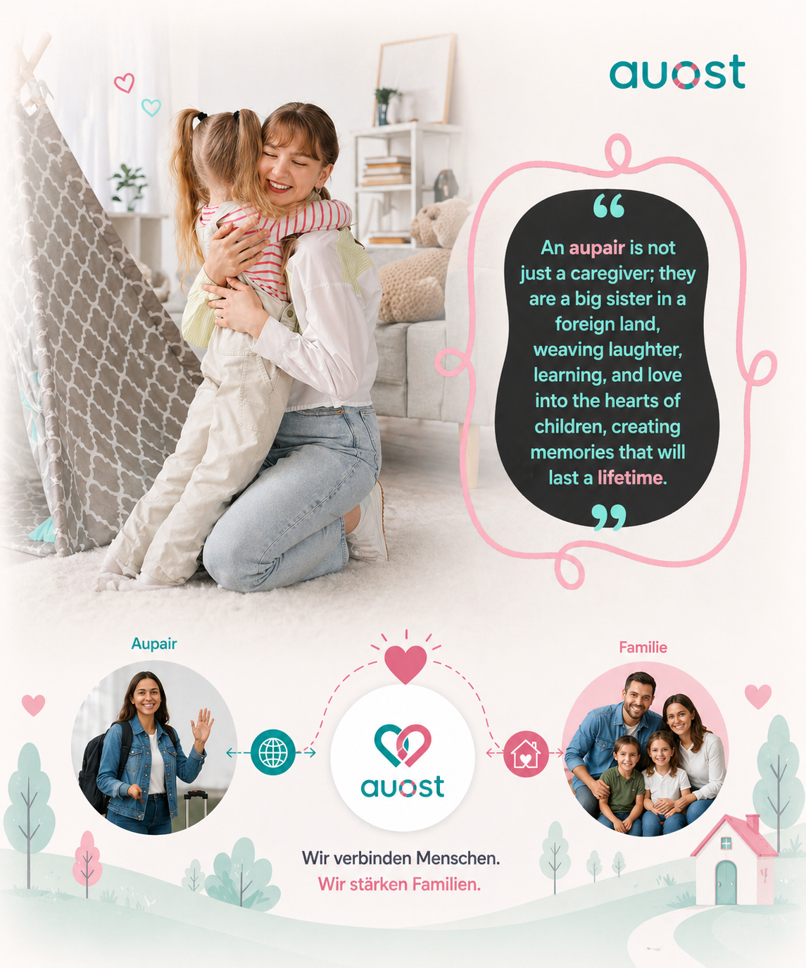 Learn More About Host FamiliesAuost helps families and au pairs find fair and exchange opportunities, ensuring clear expectations and transparent communication for all parties.